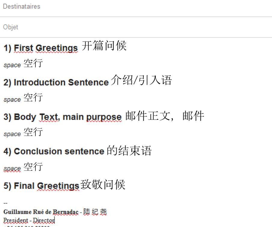 第二, 简单介绍/引入语。如果这是你写给对方的第一封邮件,可以先简单介绍自己“我是陆纪尧,是一名在中国的礼仪老师”。或者可以利用双方上次见面的事情作为引入语“自三月在北京见面后,希望最近一切都好”。