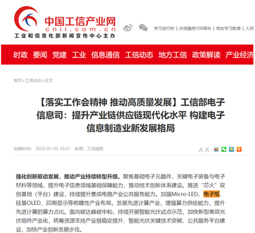 工信部重点提及加强电子纸、Micro-LED等技术前瞻性布局