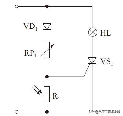 当光线亮时,光敏电阻器R1阻值小,220V交流电压经VD1整流后的单向脉冲性直流电压在RP1和Rl分压后的电压小,加到晶闸管VS1门极的电压小,这时晶闸管VS1不能导通,所以灯HL回路无电流,灯不亮。