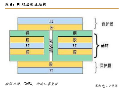 传统软板由导电材料、绝缘基材、覆盖层等构成的多层结构组成,一般使用铜箔作为导 体电路材料,聚酰亚胺(Polyimide, PI)膜、改性聚酰亚胺(Modified Polyimide, MPI)膜、 LCP 膜等作为电路绝缘基材,环氧树脂粘合剂作为保护和隔离电路的覆盖层,经过一定的制 程加工成 FPC 软板。