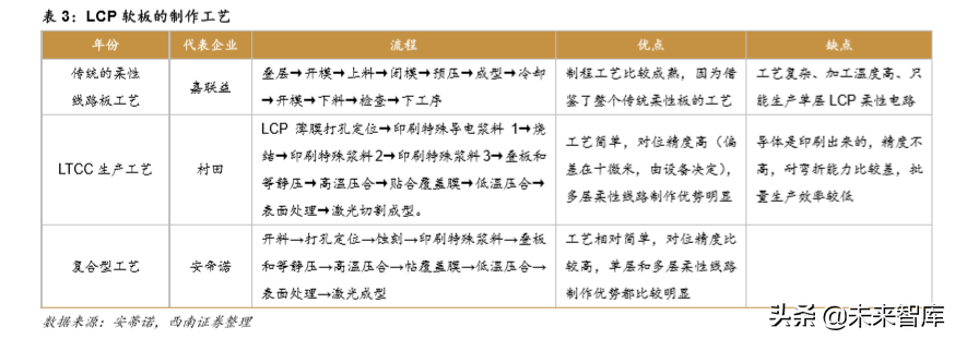 未来智能手机的发展将向着高频化和小型化发展,柔性电路板(Flexible Printed Circuit Board,FPC 软板)目前已成为天线主流工艺,占有率超过 7 成,其超薄设计将天线由早期 的外置天线发展为内置天线,随着 5G 时代到来,LCP 天线有望得到广泛应用。