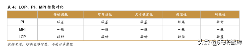MPI是一种改性的聚酰亚胺材料,具有非结晶性因此在各种温度条件下均能够进行操作, 尤其在低温压合铜箔时更易与铜的表面附着。其在 15GHz 以下的信号处理表现不逊色于 LCP 天线。在 5G 初期 sub-6GHz 时代,由于 MPI 也可以满足 5G 信号处理需求,且价格相 对 LCP 材料较低,因此 MPI 有望与 LCP 共同成为天线主流材料。但是在 15GHz 以上的信 号处理方面,LCP 的优势依然十分明显。
