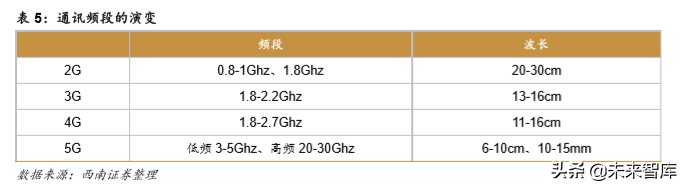 随着无线网络从 4G 向 5G 过渡,通信频率将全面进入高频高速领域。根据 5G 的发展 路线图,未来通信频率将分两个阶段进行提升。第一阶段的目标是在 2020 年前将通信频率 提升到 6GHz,第二阶段的目标是在 2020 年后进一步提升到毫米波(30-60GHz)的应用。