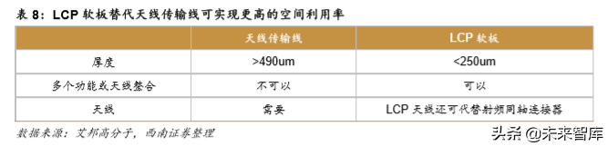 高频高速电路的需求内涵是传输信号的速度和品质,影响这两项的主要因素是传输材料 的电气性能,包括介电常数与介电损耗,具体而言,信号传输的速度与介电常数负相关,信 号品质与介电损耗负相关。传统天线短板的 PI 基材已经逐渐显示出应用的劣势,尤其在高 频传输方面,其对 2.4G 的射频信号产生 3db 损耗,并且频率越高损耗越大。相比 PI 材料, LCP 具有介电常数低(典型值为 2.9)、正切损耗小(其值为 0.0025)、热膨胀系数低、介电 常数温度特性好、高强度、灵活性、密封性(吸水率小于 0.004%)等优点。 在微波频段, LCP 具有非常稳定的介电特性,损耗相比传统基材的电磁损耗要小 10 倍以上,能够有效降 低信号损失。并且,基于 LCP 的微波器件不仅可以在平面状态下使用,也可以在弯曲甚至 折叠的环境下使用。伴随智能手机对空间利用的极致追求,LCP 软板将凭借更优的空间效率 替代天线传输线。