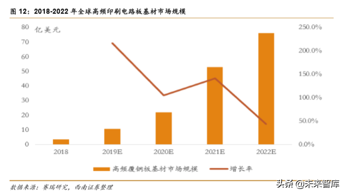 仅考虑基站天线市场,预计到 2022 年高频印刷电路板基材市场规模将达到 76 亿美元, CAGR 超过 115%。