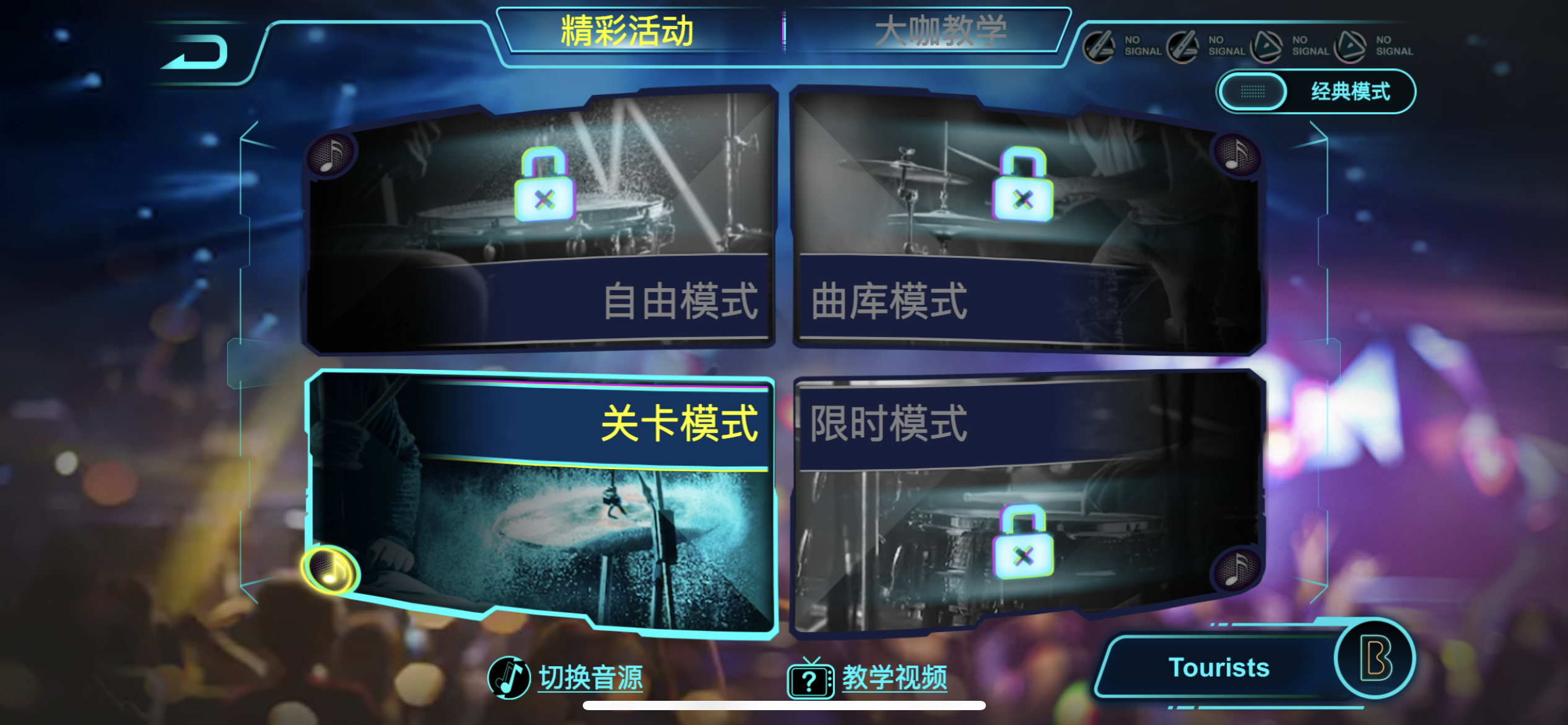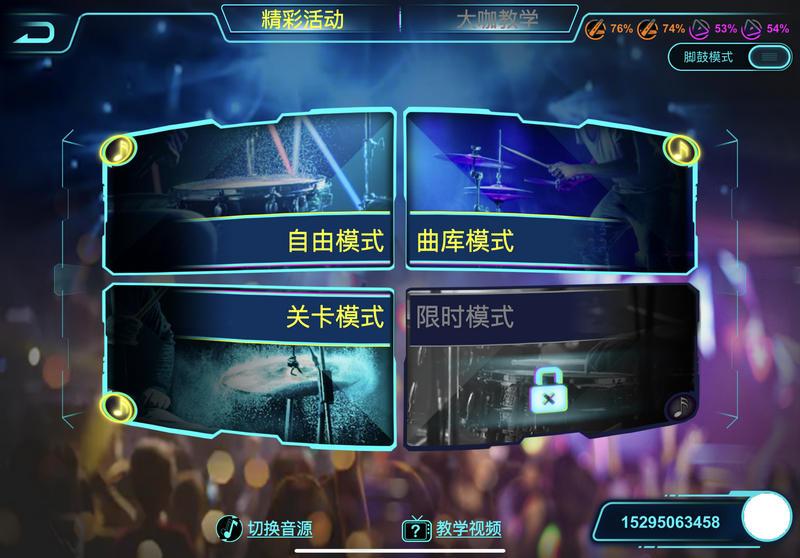 它有闯关模式、曲库模式和自由模式可选,对于新手入门来说,可以先从闯关模式开始学习,30分钟就能初步学会打体感架子鼓。老手来玩这个就更具有娱乐性了,可谓是游刃有余,边玩边学,打开音乐新世界的大门。