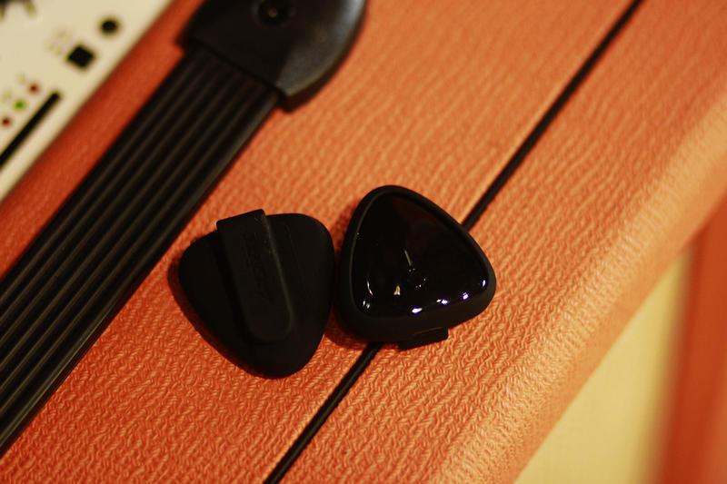 空气拨片搭配硅胶套,摇身一变成为体感架子鼓的脚步传感器。只要单机拨片按键,就可以一键切换脚鼓或者踩镲模式。非常有趣的现象是,我们右手捏拨片,左手通过手机APP切换和弦,脚鼓传感器就可以成为吉他拨片,实现吉他功能。