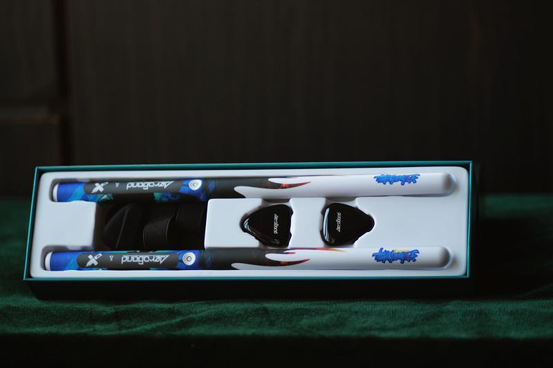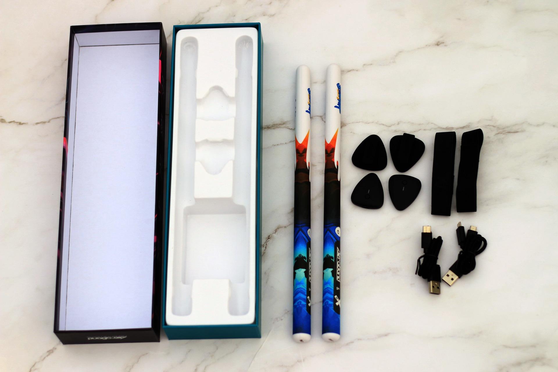 首先收到的是一个体积小巧、有点类似装礼品的盒子,显得精致。打开盒子可见两根鼓槌,颜色看起来比较花哨,都标上了这就是街舞的字眼。两个脚鼓传感器则是一般的黑色外观,低调深沉。脚鼓传感器体积小巧,大概是一个瓶盖的体积,同时他还是可以弹吉他的拨片。另外还有两个绑带,用于固定脚踩。两条双充数据线,都是一拖二的设计,方便两个设备同时充电。