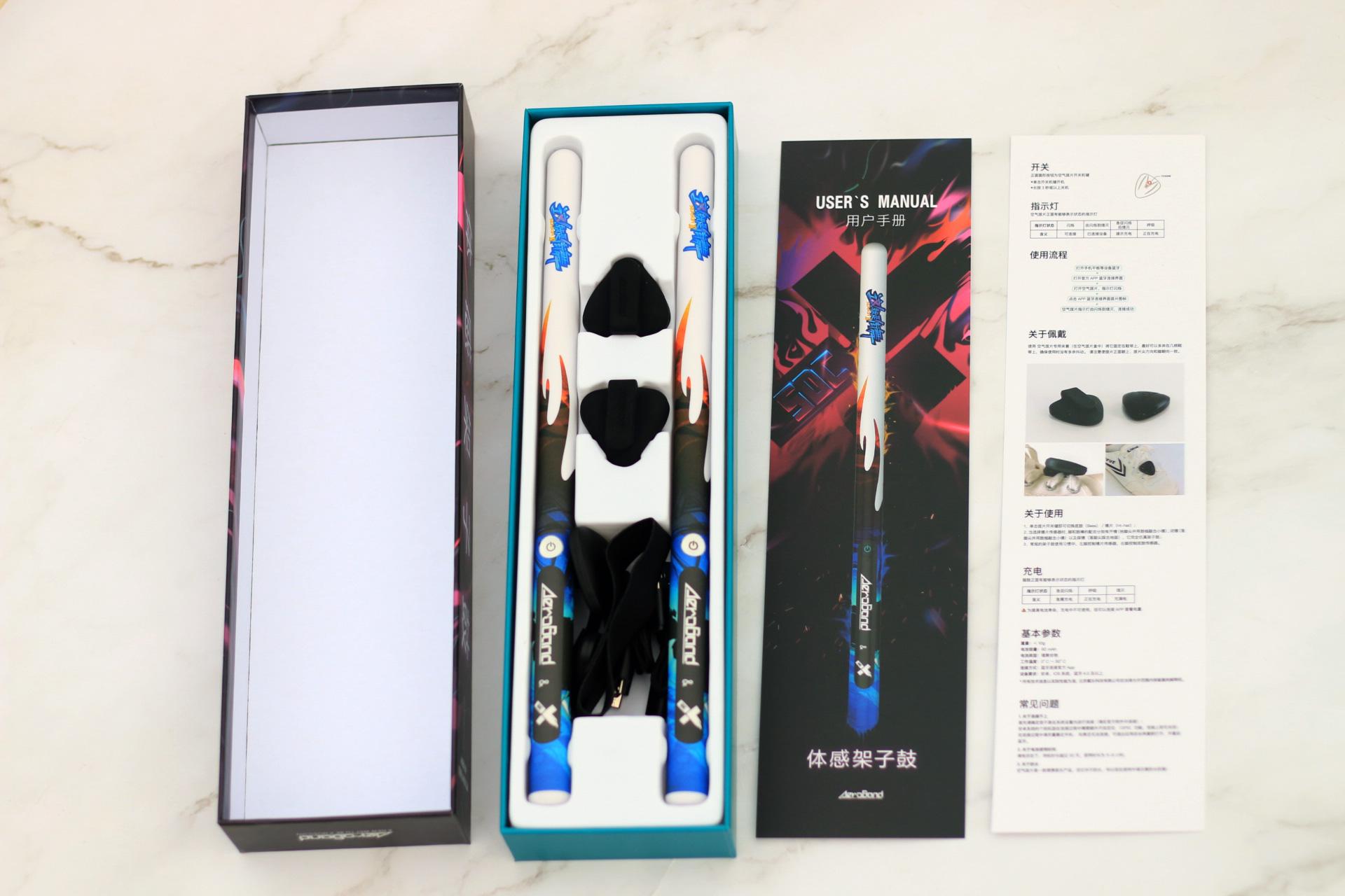 收到货之后,迫不及待的拆开包装,包装清单里面包括有体感架子鼓2个、脚部传感器2个、硅胶套2个、绑带2条,然后就是充电线、说明书。
