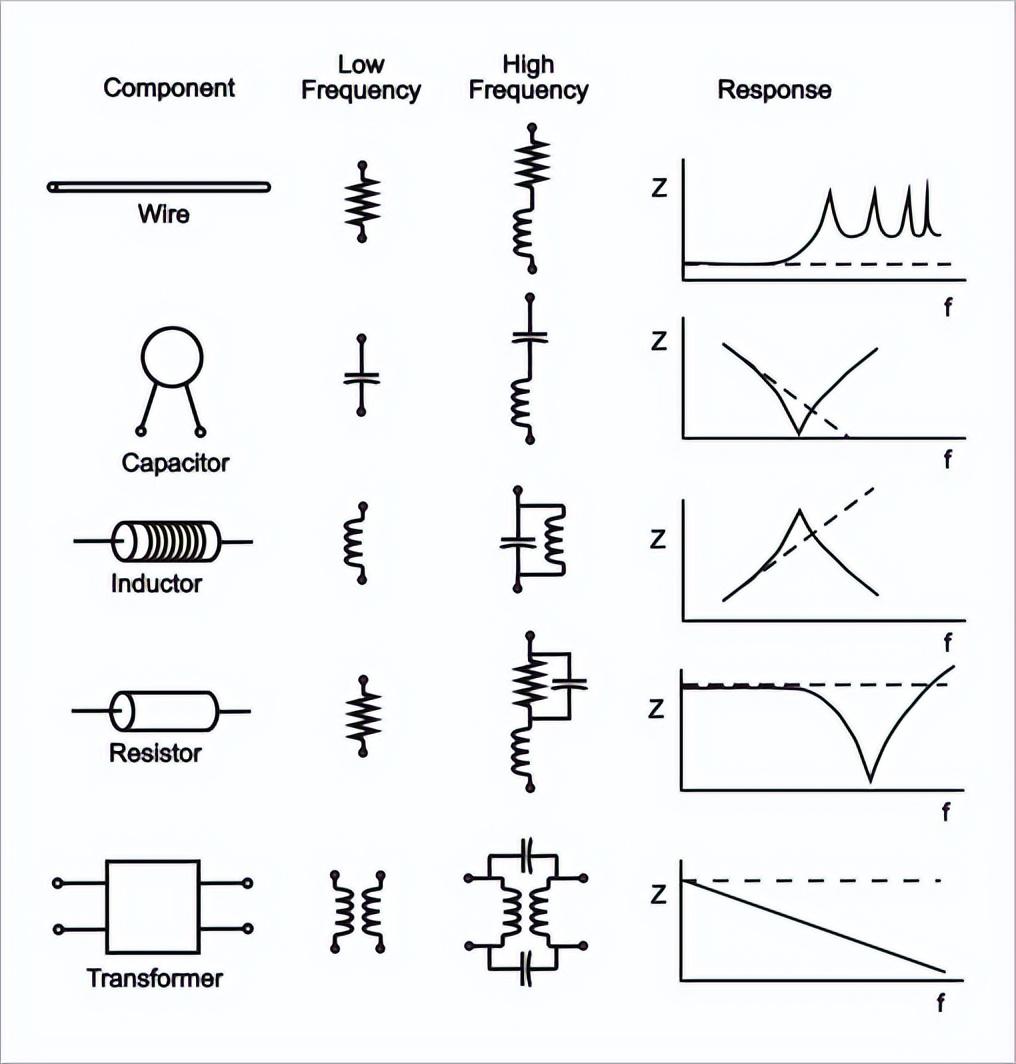电阻 : 由于其长度可以产生寄生电感; 两个电极之间会产生寄生电容。电容 : 由于其具有长度所以产生寄生电感; 两个电极之间的电介质的漏电会产生损耗电阻; 它的两个电机引线之间的寄生电容可以合并到电容本身主参数中。电感 : 在电感的绕组之间存在的电容以及两个电极之间之间也会存在寄生电容; 引线的损耗电阻会随着工作频率的增加而显著增加。除了器件本身的寄生效应之外,当器件焊接在电路板上之后,器件与电路板引线之间、器件与器件之间也会存在着不同的寄生参数。