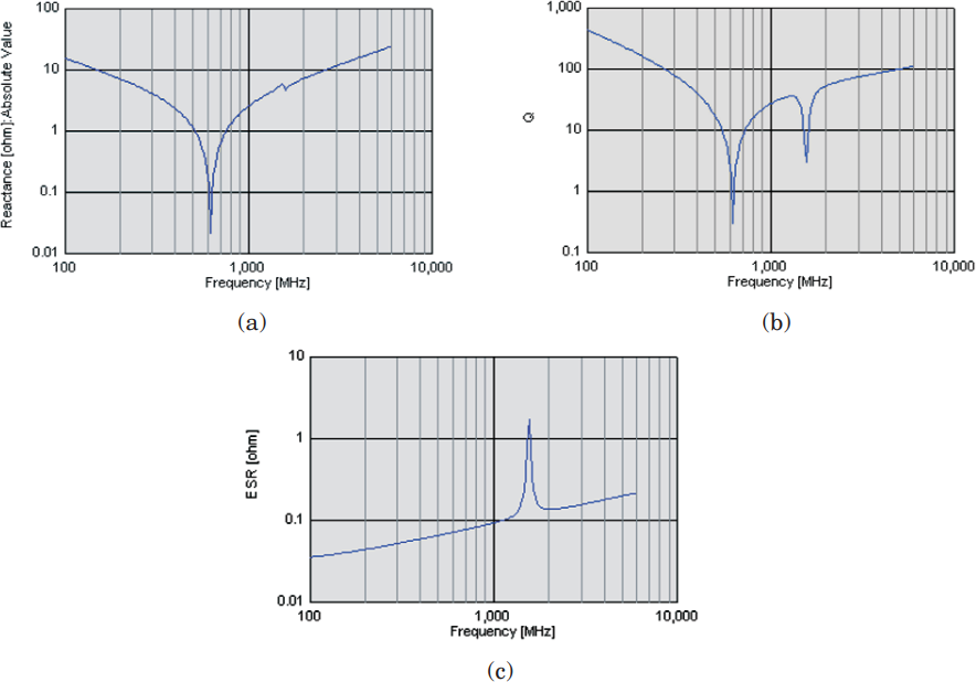 ▲ 图1.2.3 电容频率特性:(a)容抗;(b)Q;(c)等效串联电阻(ESR)