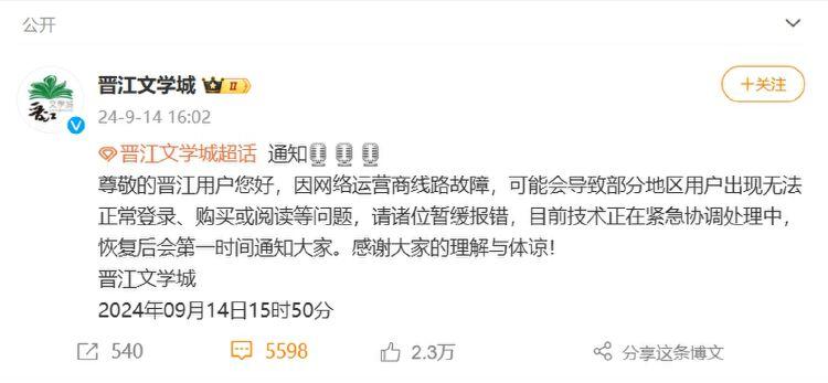 对此,晋江文学城今日下午16时许回应称,因网络运营商线路故障,可能会导致部分地区用户出现无法正常登录、购买或阅读等问题,请诸位暂缓报错,目前技术正在紧急协调处理中,恢复后会第一时间通知大家。