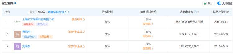 股东名单显示,该公司50%股权由上海宏文网络科技有限公司(盛大文学) 持有,晋江文学城创始人兼董事长、总经理黄艳明及创始人总裁刘旭东分别持股30%、20%。