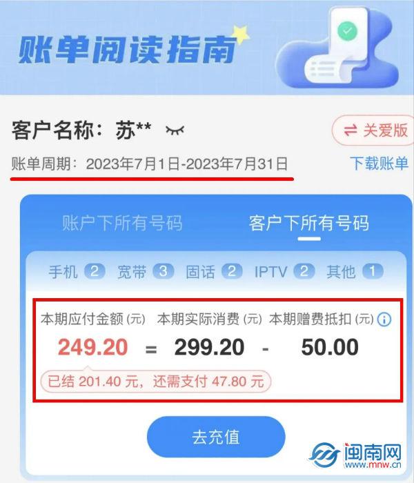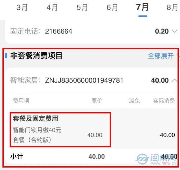 8月7日,漳州市民苏先生查询话费账单时发现,手机号码被捆绑了一个“智能门锁月缴40元套餐(合约版)”,且每月实际费用也较此前多了40元——从209元变成249元,只因其在今年6月份接到了一位自称漳州电信工作人员的电话。