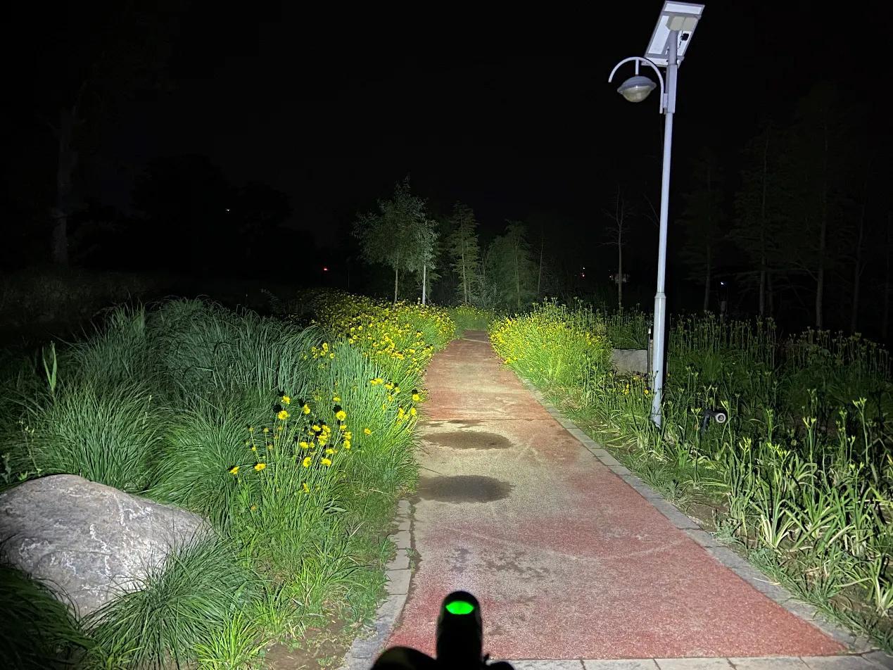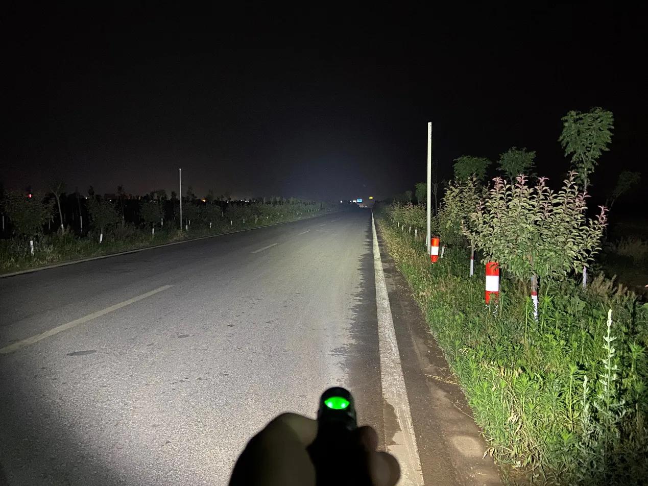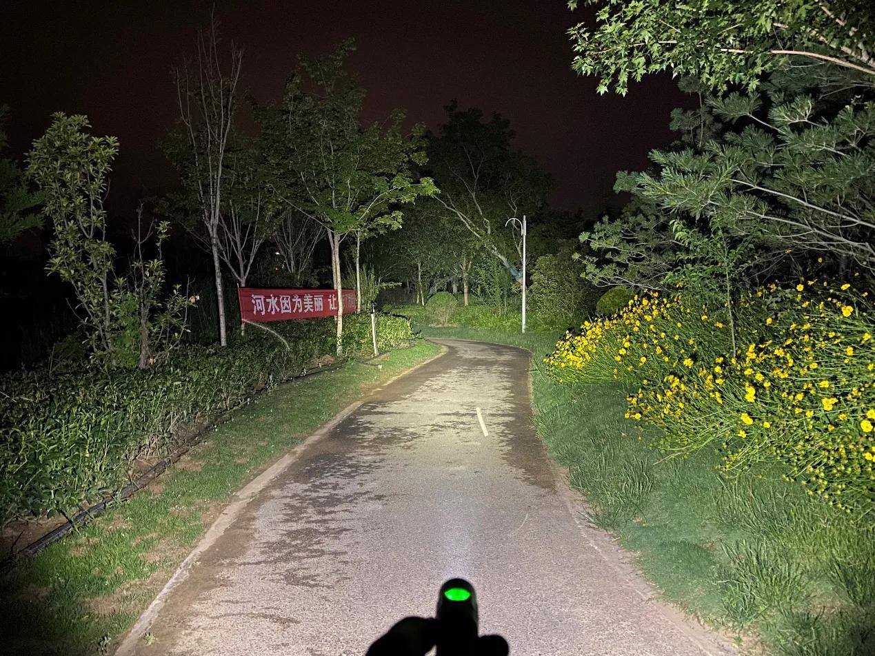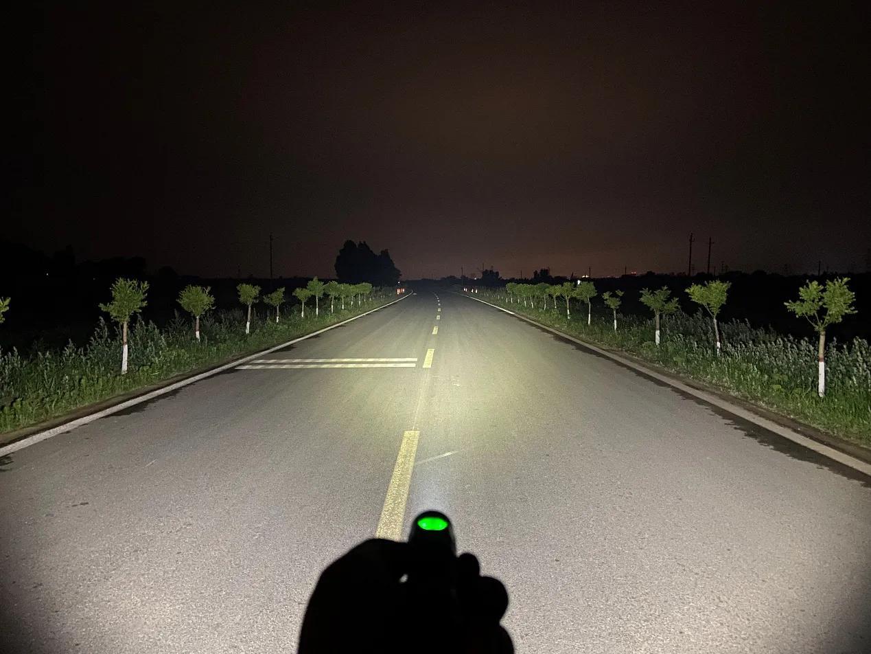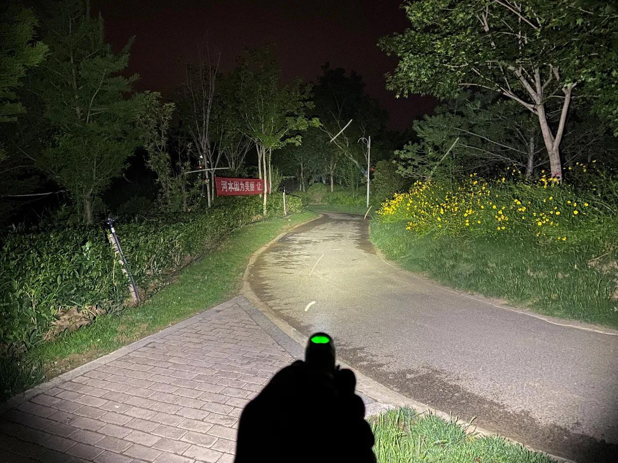 SC31 Pro采用流明纳斯SST40高性能LED灯珠,配合光面金属反光杯,投射出的光斑比较均匀,中间位置有明显的光斑,泛光区域也比较广阔。我手里的这款是5000K色温的灯珠,接下来一起来看下夜射,以下均为2000流明的极亮实际使用效果。