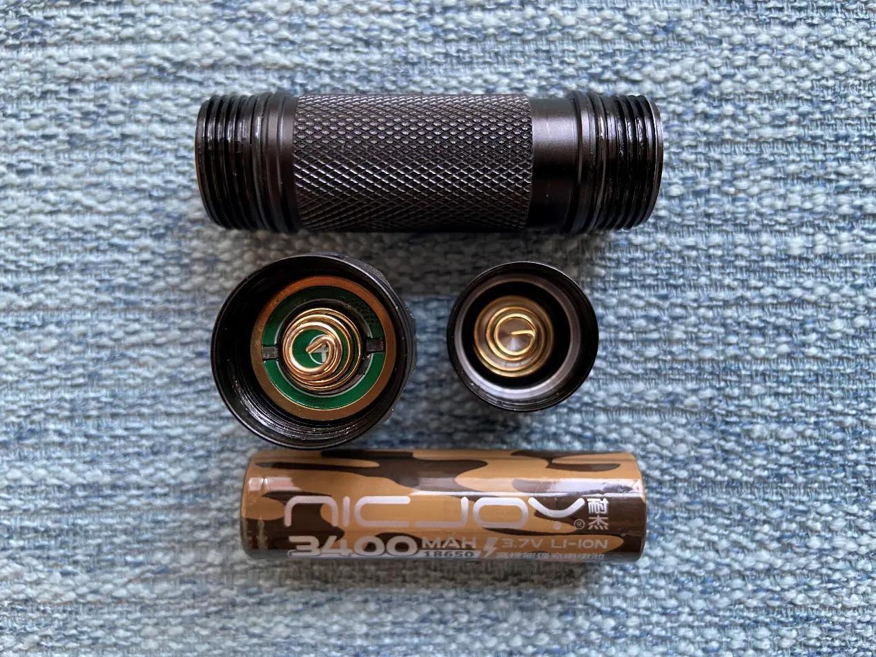 筒子前端以及尾盖和电池接触的位置都是采用弹簧的设计,前后双弹簧,这样的设计使得电池的兼容性较广,同时跌落是手电也不会出现接触不良导致关机的问题。在电池方面SC31 Pro实测可以使用18650平头电池,尖头电池以及带保护板的电池。