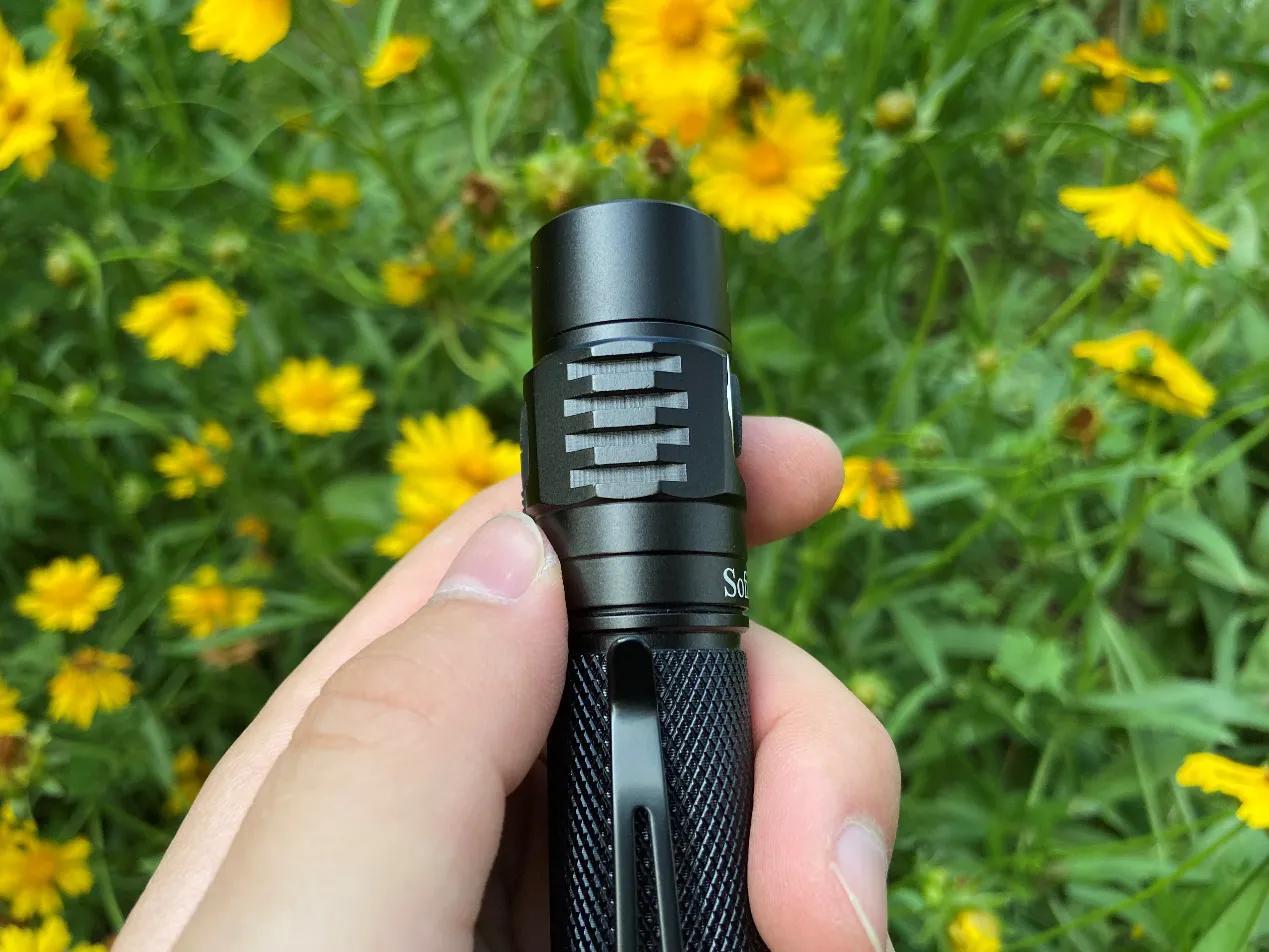 散热槽的边缘是平面的设计,配合包夹,可以起到防滚环的作用,可以有效起到防滚落的作用,防止日常将手电放在桌面上会自己滚落。有效降低了将手电放在床头,茶几,或者办公桌上意外滚落的风险。