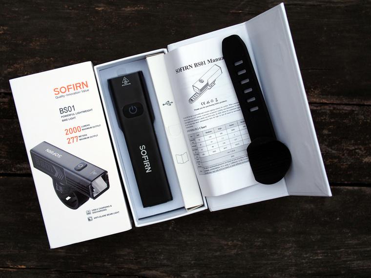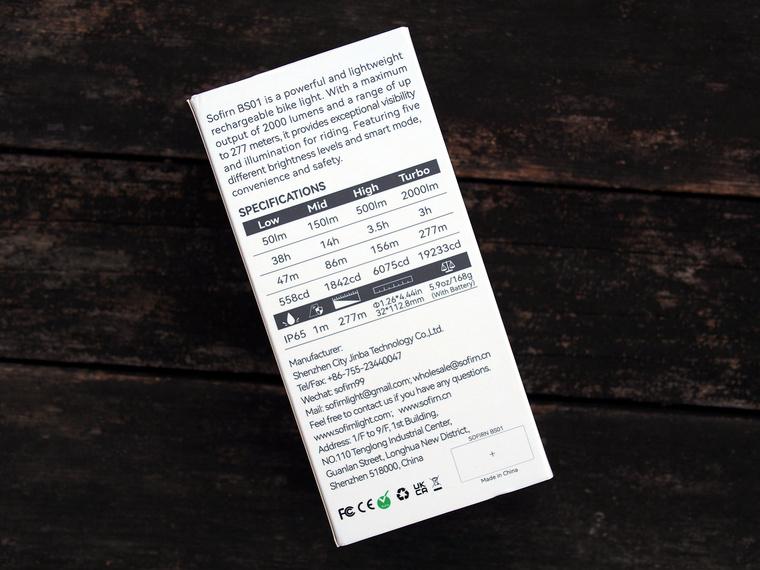 BS01内置一颗可充电21700锂电池。最大光通量2000流明可以使用3个小时,最低亮度50流明可以使用38个小时。车灯尾盖由四颗螺钉固定,尾部平面上面有CE认证标识和环保标识。