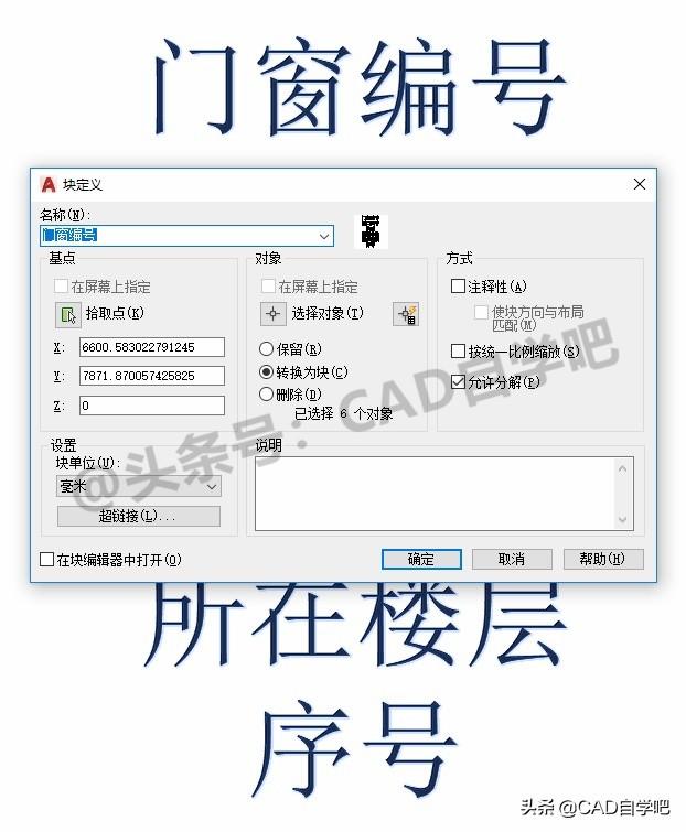 定义块后,出现图示设置面板,根据门窗不同属性输入不同的标签内容;