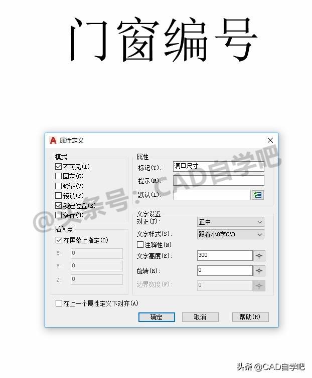 定义属性文字:输入快捷键“ATT”,根据提示设置“门窗编号”的标记,设置文字样式和文字高度,设置对正样式为“正中”,确定进入下一步;