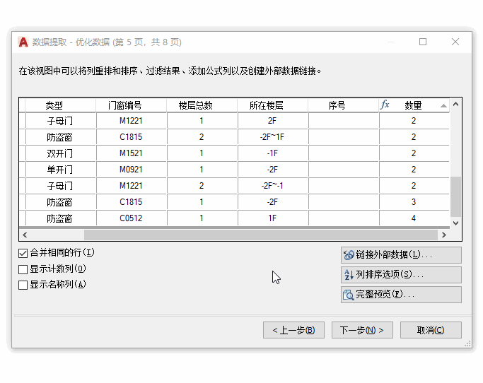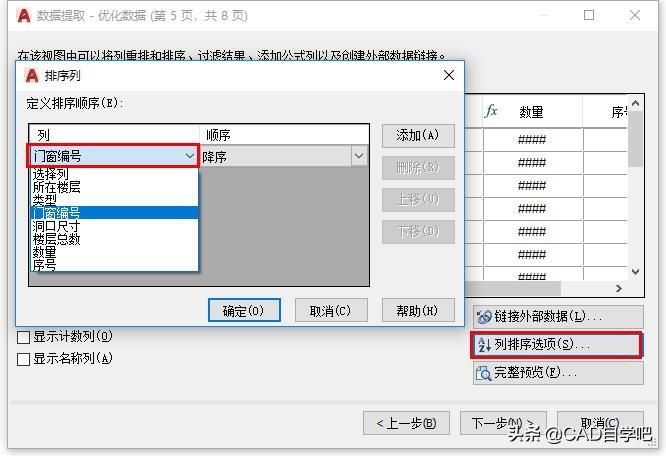 设置“列排序选项”,然后选择“列”为“门窗编号”,选择确定;