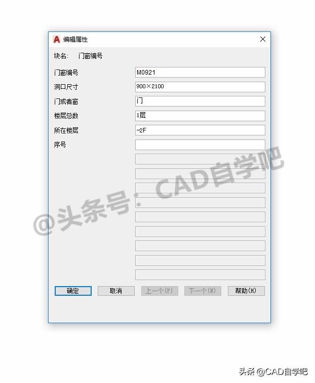 根据图中门窗不同属性吗,复制多个“门窗编号”的块,然后设置其对应的各种信息