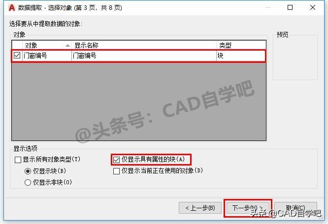 选中✔仅比显示具有属性的块,对象中自动显示出“门窗编号”的属性块;