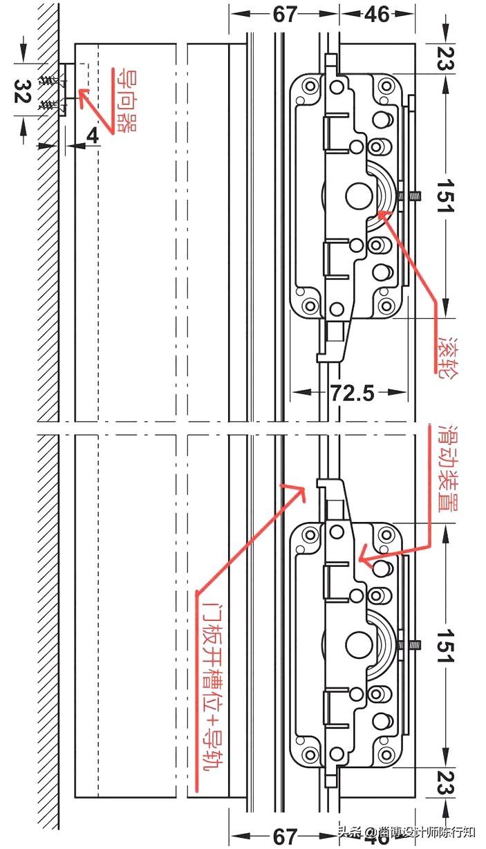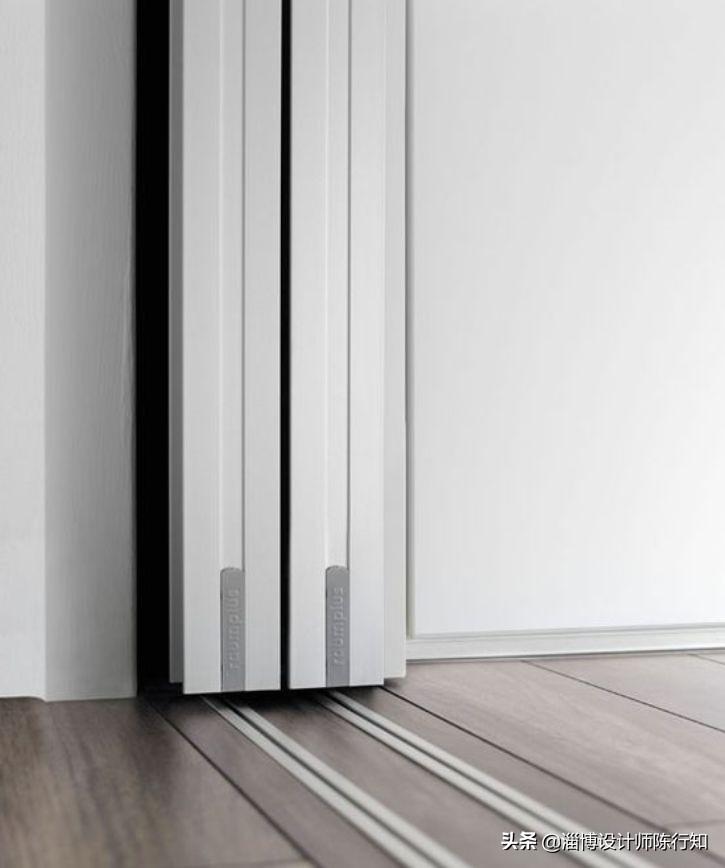 虽然我们一直强调,现在很多设计中,都是采用吊轨的形式来做移门设计,但当移门过重或把移门换为柜体,又或者需要靠地轨分割空间时,则通常会选择用地轨受力、吊轨固定的方式来进行移门设计。