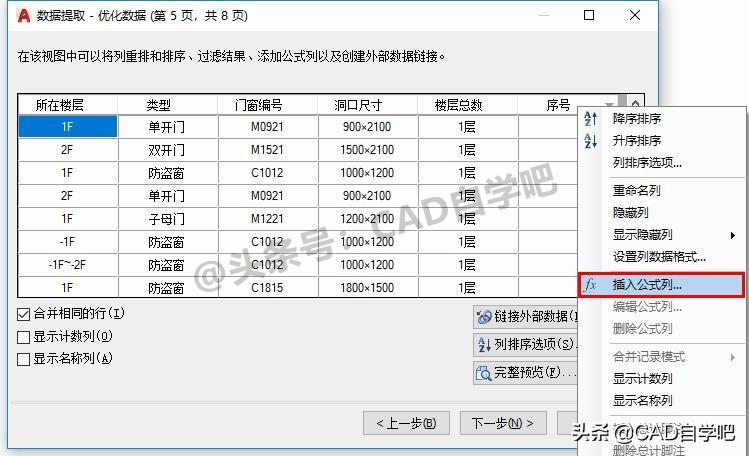 提取出当前所有“门窗编号”属性块的类别,生成一个初始比预览表格;然后右键选择“插入公式列”;