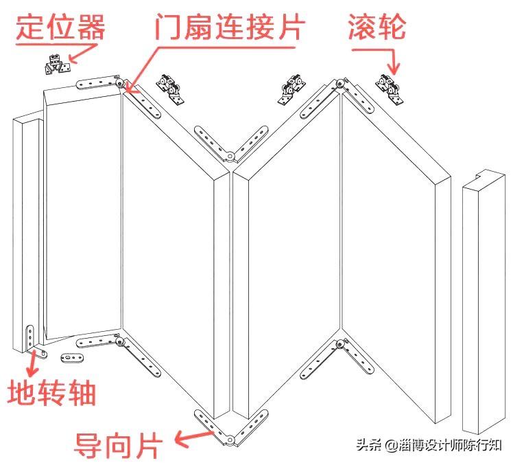 我们之前提到过,折叠门和推拉门可以简单的理解成一回事,只是折叠门在推拉门的基础上加入了门的开合构件元素,当门受外力拉开时,通过开合构件和天地转轴的作用,让门得以折叠打开。