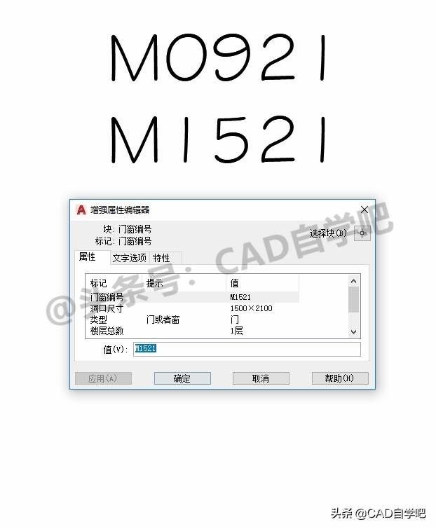 仅仅选中✔属性,表格中特性显示出对象“门窗编号”属性块各个设置的不同标签内容;
