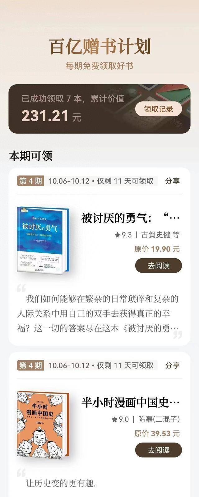 但华为阅读却给了我一个惊喜,它家的“百亿赠书计划”简直是电子阅读界的“及时雨”!要知道,我可是个资深“书虫”,但“书到用时方恨少”的窘境也常常让我抓狂。买书吧,钱包哭泣;不买吧,又怕错过好书。 这“百亿赠书计划”完美解决了我的难题,让我在免费阅读的同时,还能体验到专业编辑团队严选好书的乐趣。这感觉,就像在茫茫书海中,有位贴心的导游,为你指引方向,省去了我“选书一整天,阅读一小时”的痛苦经历。