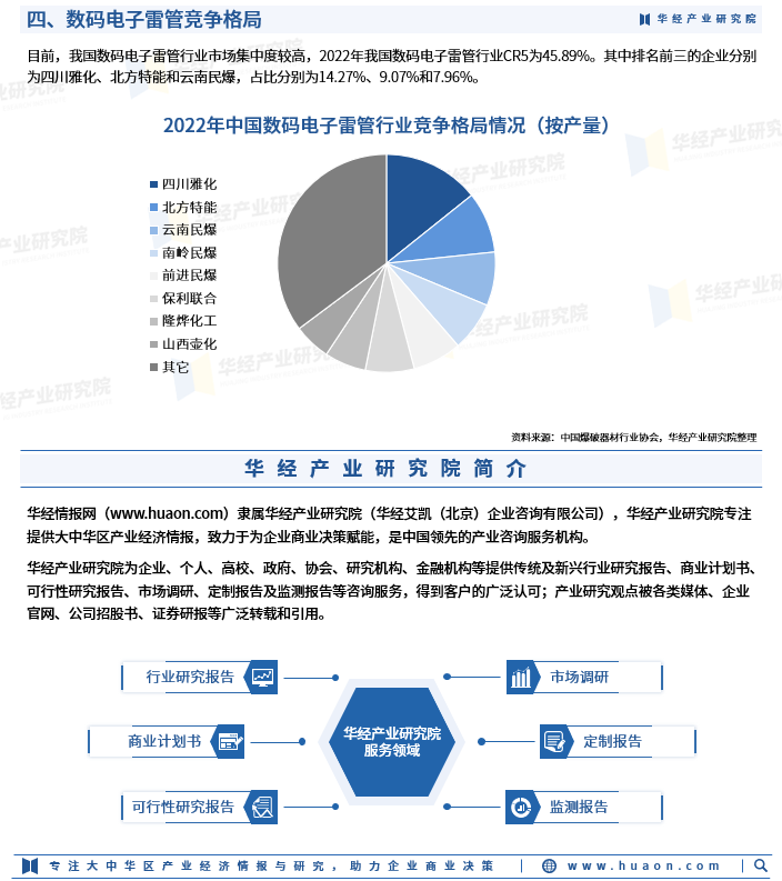 以上数据及信息可参考智研咨询发布的《2022-2028年中国电子雷管行业供需态势分析及市场运行潜力报告》。智研咨询是中国产业咨询领域的信息与情报综合提供商。公司以“用信息驱动产业发展,为企业投资决策赋能”为品牌理念。为企业提供专业的产业咨询服务,主要服务包含精品行研报告、专项定制、月度专题、可研报告、商业计划书、产业规划等。提供周报/月报/季报/年报等定期报告和定制数据,内容涵盖政策监测、企业动态、行业数据、产品价格变化、投融资概览、市场机遇及风险分析等。