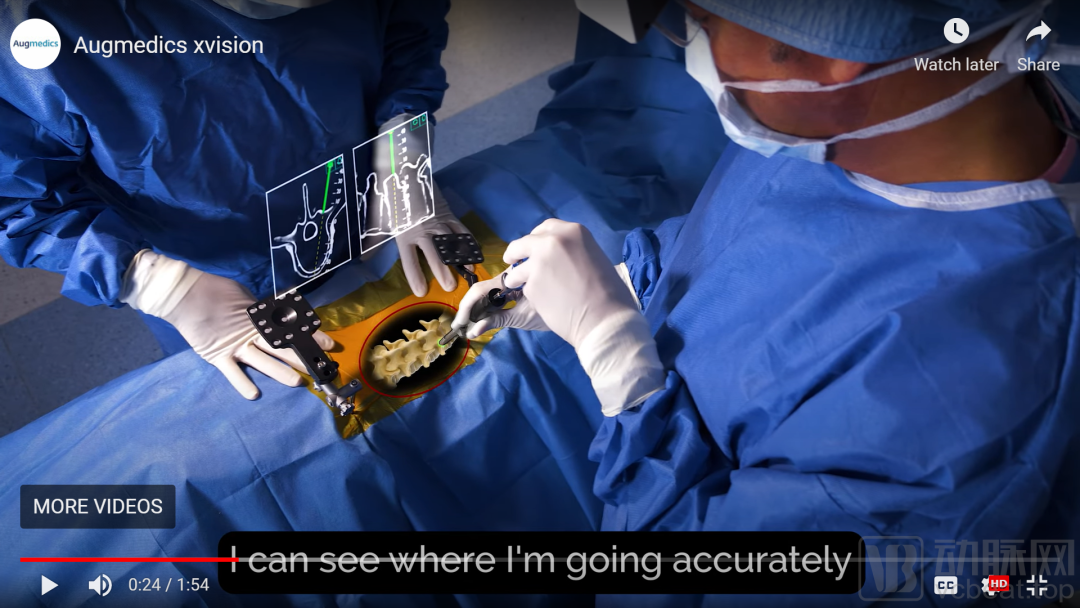 Augmedics的Xvision Spine System(XSV)是首个获得FDA批准的可以用在手术中的AR导航系统。医生戴上AR设备后,就可以直接在眼前清晰的看到患者的3D脊柱结构、手术器械和植入物的位置和走向,像是直接用眼睛为患者进行了CT扫描,并且避免了注意力的转移。XSV系统具备98.9%的经皮植入物放置精度。