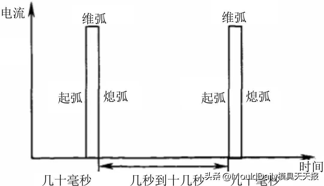 据国内外专家研究,大部分冷焊机的工作原理均满足式(1),现所述的缺陷修复采用的波形如图5所示,从波形的特征可知,2个脉冲间隔之间没有维弧电流,如图6所示,随即进入熄弧冷却阶段,因而冷却时间大于加热时间,该过程中有足够的冷却时间使得零件一直处于常温状态[5]。