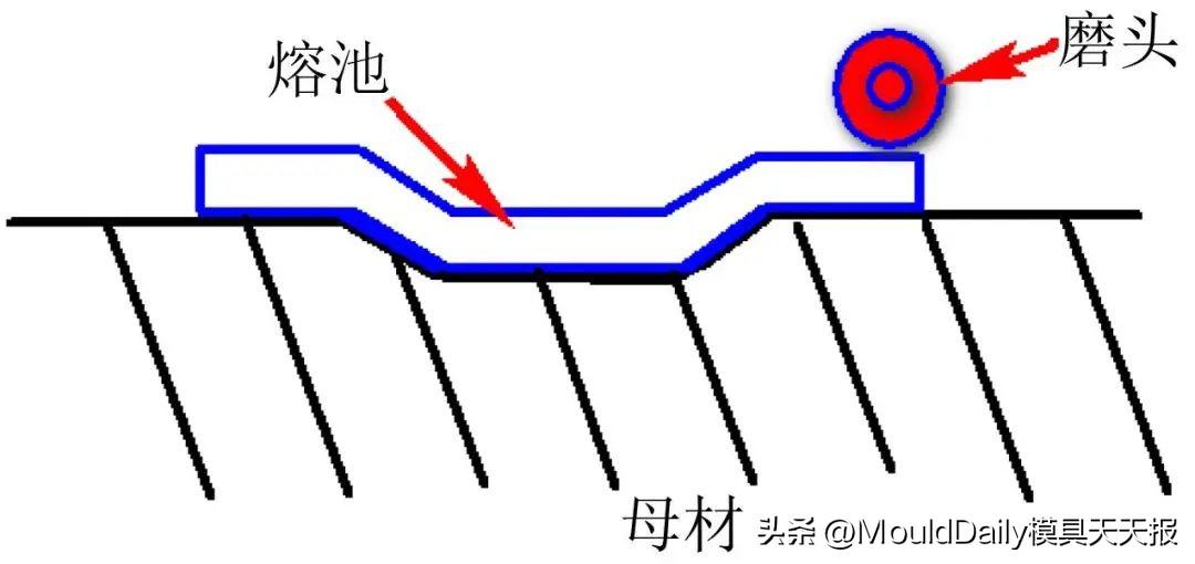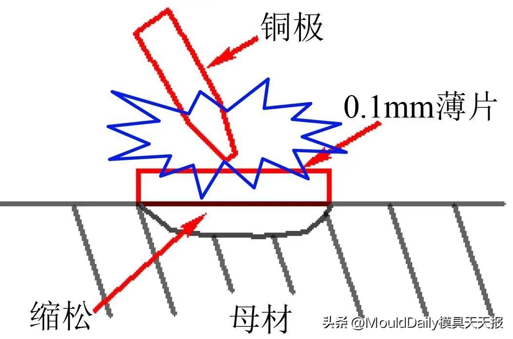 实现冷焊的原理是放电时间与下一次放电间隔时间相比较短,机器有足够的相对停止时间,热量会通过模具基本体扩散到外界,因此模具的被加工部位不会有热量聚集。虽然模具的升温几乎停留在室温,可是由于瞬时融化的原因,电极尖端的温度可以到达10000摄氏度左右。焊条瞬间产生金属熔融,过渡到母材金属的接触部位,同时由于等离子电弧的高温作用,表层深处开成像生了根一样的强固的扩散层,呈现出高结合性,不会脱落。