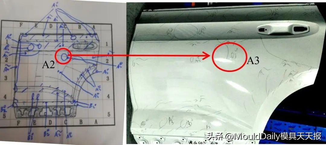 因门外板属于外观件,对其外观有严格的要求,不允许存在凹凸面、凹凸点等A2等级的缺陷。模具调试完成后,在正常参数条件下生产,制件A面存在A2凸面,经过多轮调试优化,最终A2凸面转化成A3凸面,如图10所示,但不能完全消除此缺陷。