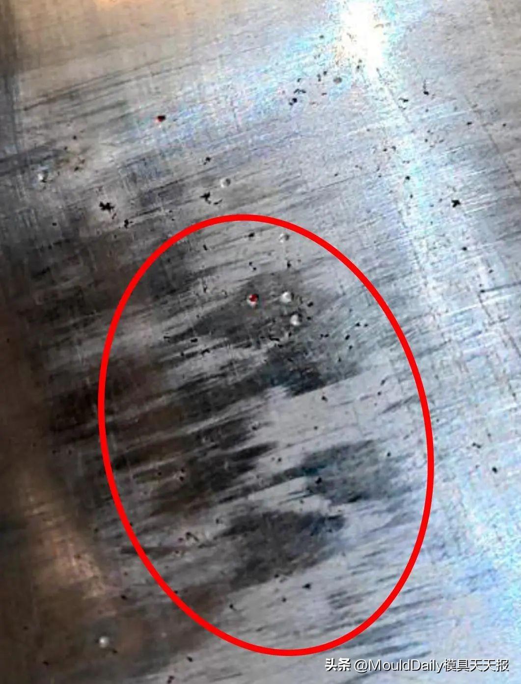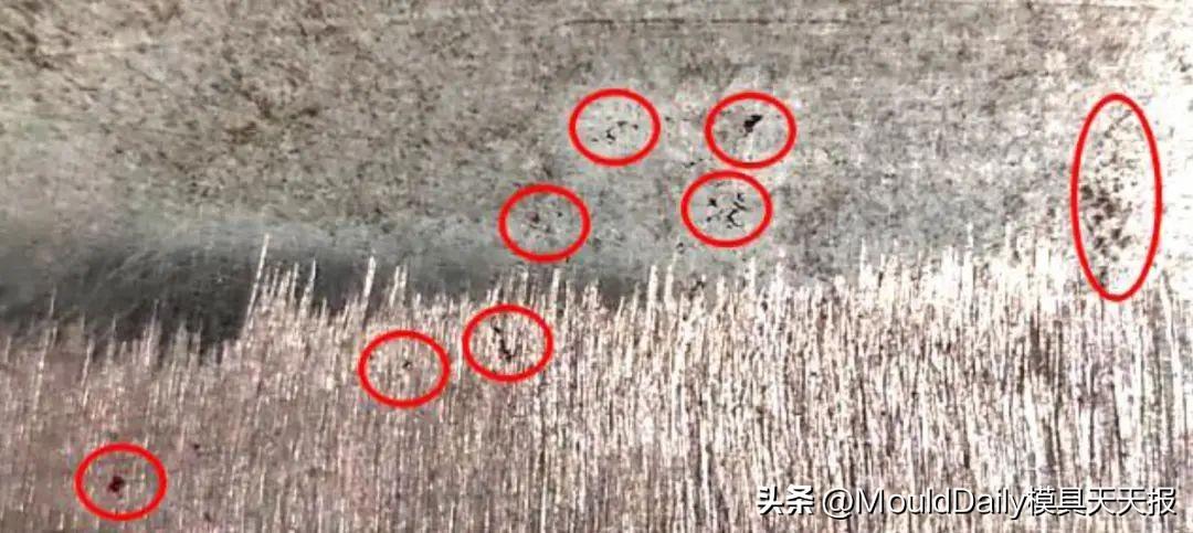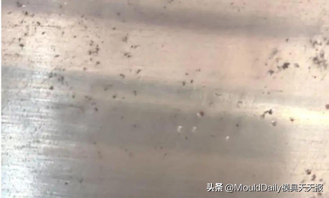 模具制造过程中,在模具零件精加工完成后,检查加工质量时,发现凸、凹模型面上有较多如图3所示的缩松,其研合抛光完成后缩松如图4所示。