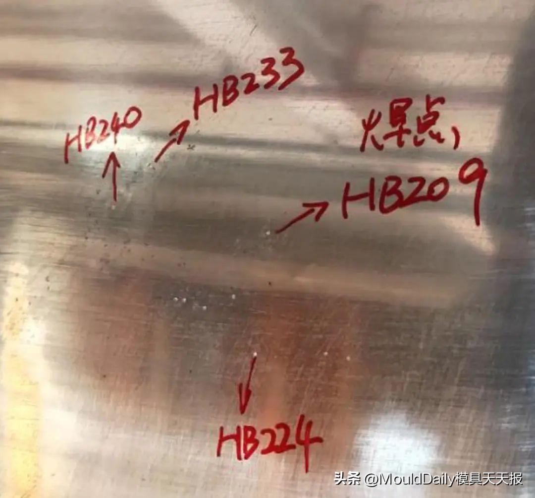 修补完成后的模具零件型面如图9所示,测量补焊位置的硬度为209~240 HB,与母材的硬度基本一致,从单个修补缺陷后的硬度数据来看,说明焊接工艺符合要求。