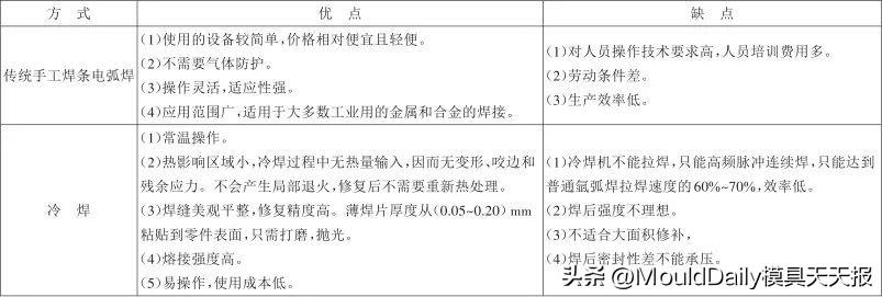 相对于传统手工焊条电弧焊,冷焊的优缺点如表1所示。