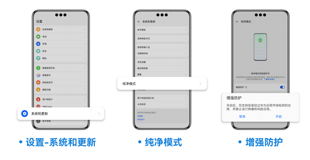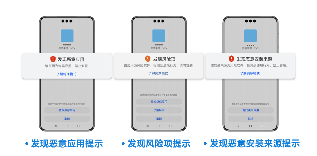 以华为应用市场为例,它对上架发布的应用有严格的安全检测,覆盖安全、隐私、内容合规、功能兼容性等多个检测项,通过各领域审核专家的复核后才能上架,并且为防止用户的手机受到恶意软件的侵扰,保护用户的隐私和数据安全,华为应用市场“兵分两路”对恶意软件进行“围追堵截”。一路“兵马”是纯净模式,它构建了系统基础保护机制,为用户提供更安全可靠的应用安装和运行环境,在纯净模式下,用户一旦安装非华为应用市场来源的应用(如浏览器下载等),将收到安全提醒,如果用户误触下载,则需要点击继续安装并进行用户验证,以防止恶意软件偷偷安装。另一路“兵马”则是增强防护,在开启增强防护的状态下,仅支持安装经华为应用市场安全检测的应用,获得更高等级和更便捷的安全防护。