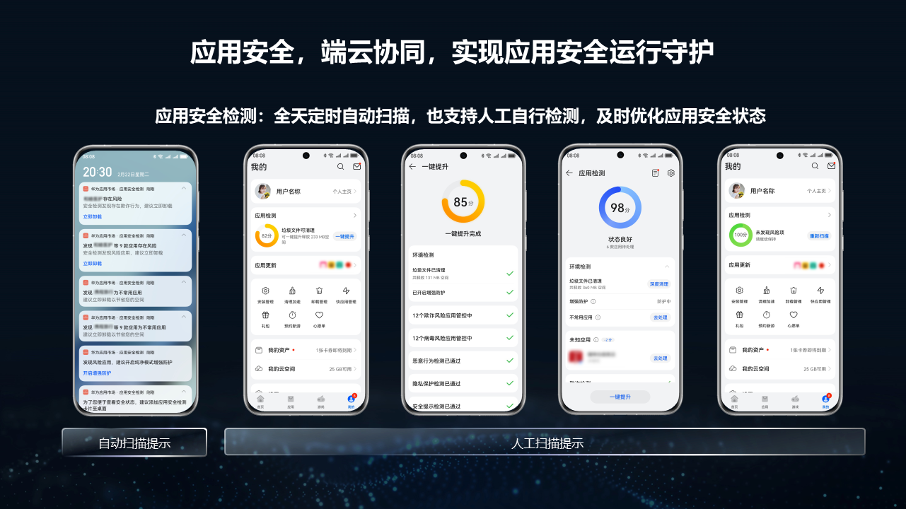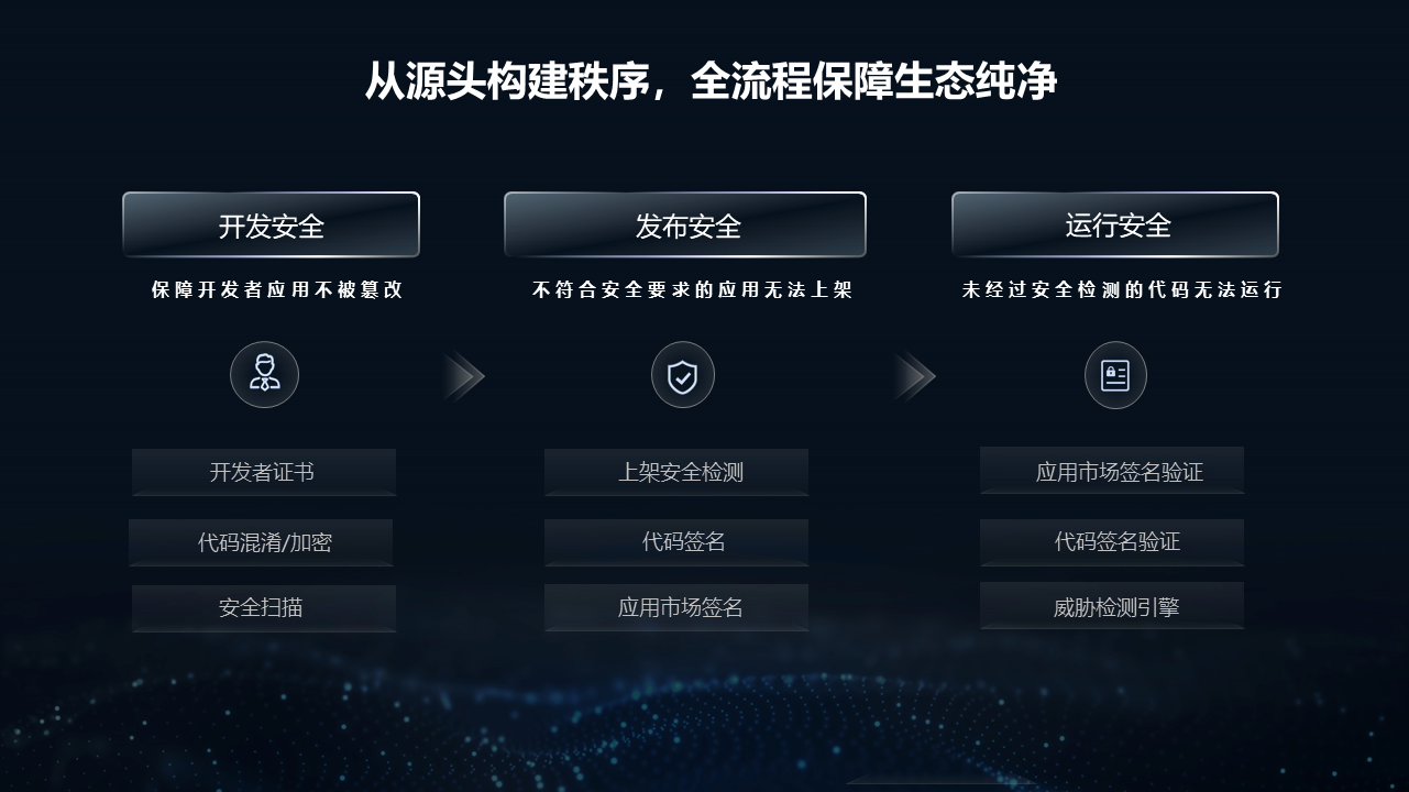 根据华为应用市场统计数据,2023年期间,华为应用市场采用系统自动化检测与人工审核相结合的方式,共完成103万次的应用上架审核,其中上架拦截量48万款次,拦截率46.69%。纯净模式日均拦截超950万次,其中未知应用拦截日均超310万次,风险应用日均拦截约77万次,每日触发自动检测的设备数约2.2亿……秉持“安全第一”的原则,用责任与专业为保障网络安全贡献力量。