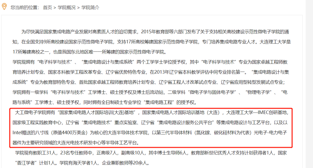 除了是国家第三批集成电路人才培养基地之外,大工微电子还拥有以Intel赠送的八寸线(原值4400万美金)为核心的大连半导体技术学院,以及各类教育中心和半导体工艺平台。