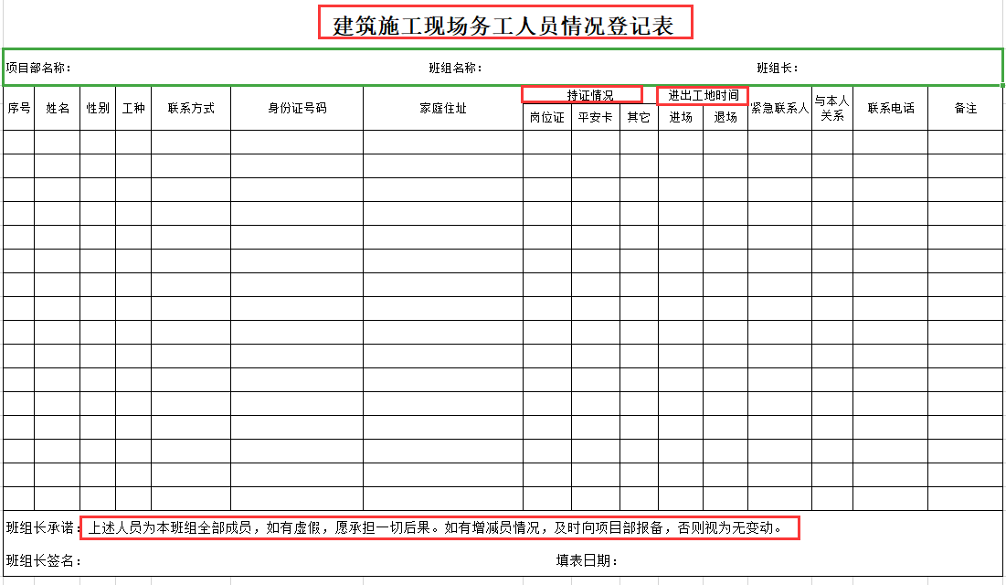建筑施工现场务工人员情况登记表