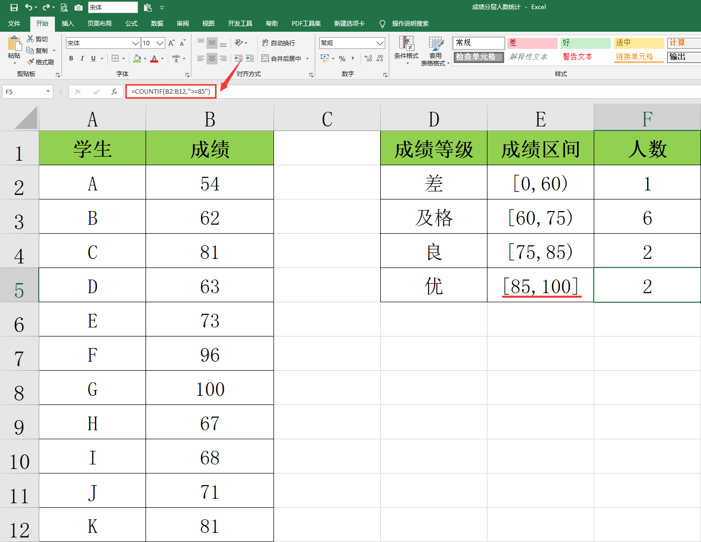メ统计[85,100],输入函数:=COUNTIF(B2:B12,">=85")。メ