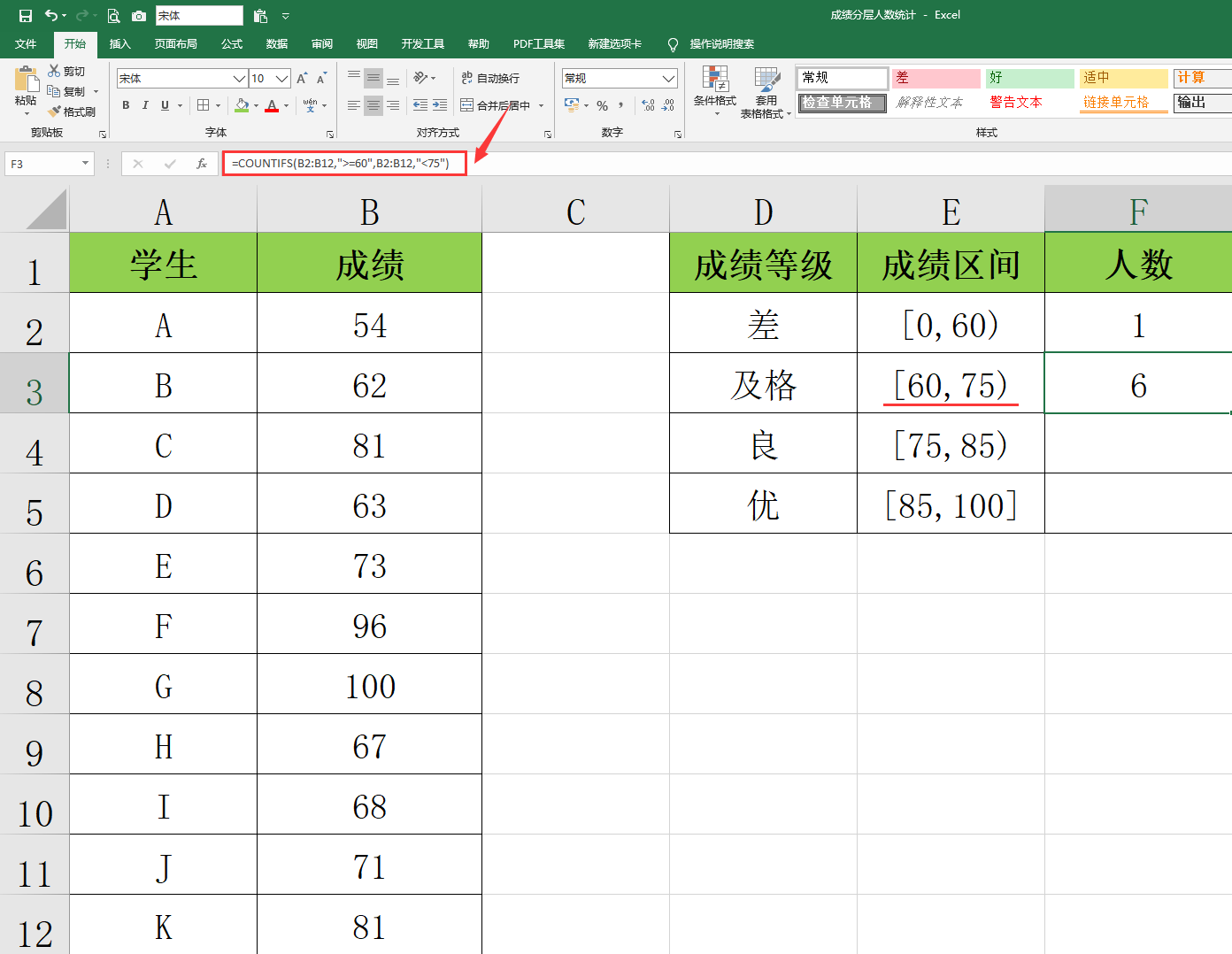 メ统计[60,75)则需要用函数:=COUNTIFS(B2:B12,">=60",B2:B12,"<75")。メ