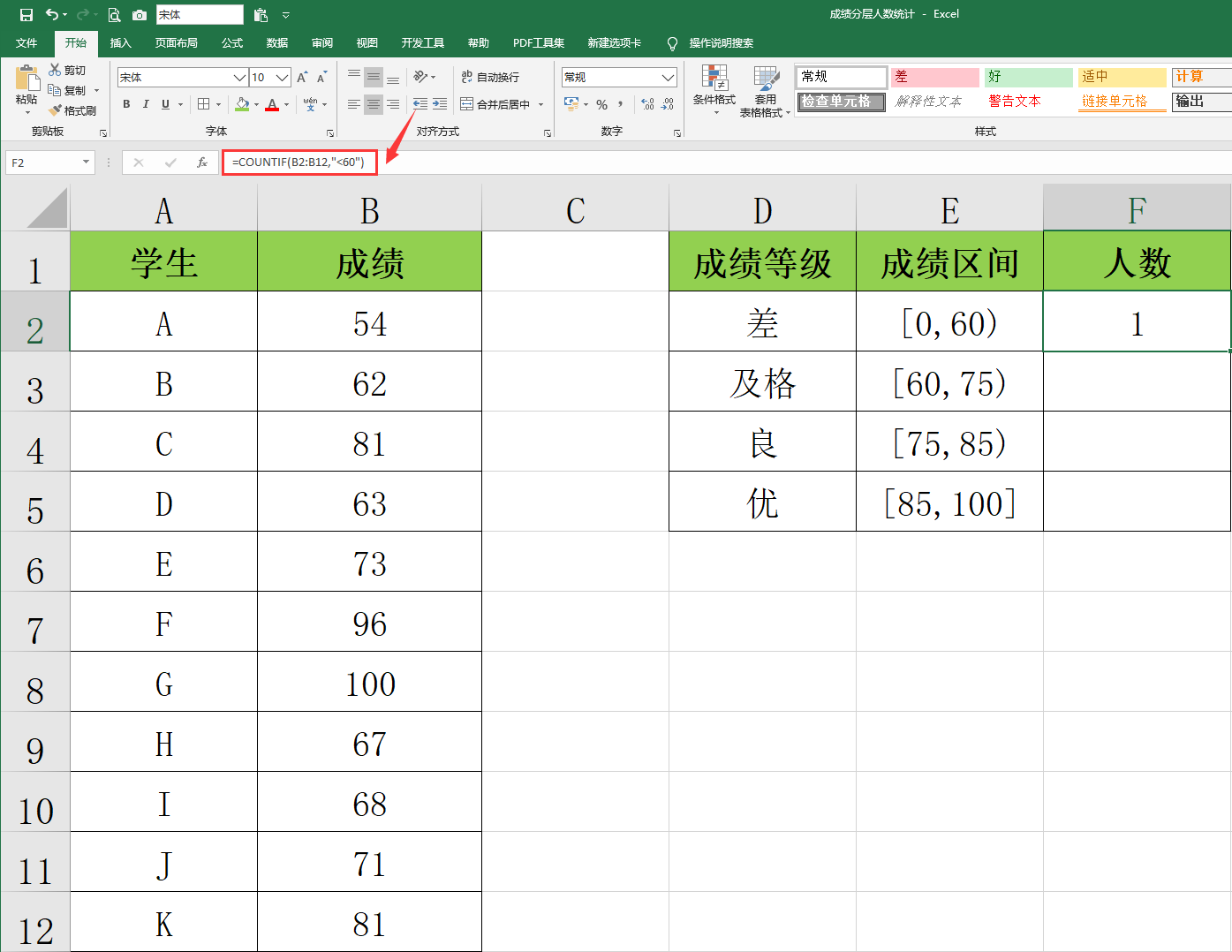 メ一般,我们可以用COUNTIF与COUNTIFS函数来统计,在F2输入函数:=COUNTIF(B2:B12,"<60")。メ