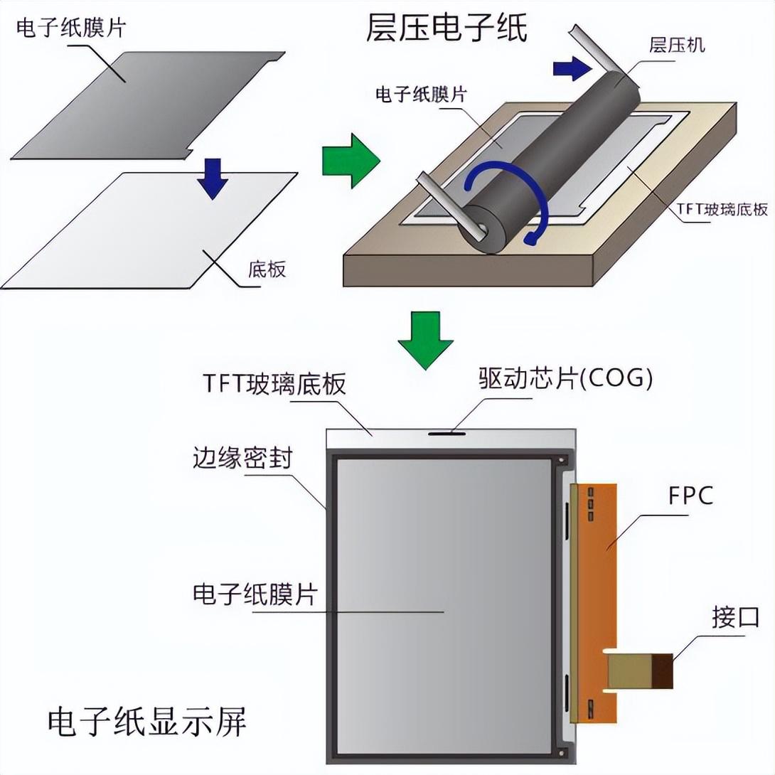 电子纸技术是一种“微胶囊电泳显示”技术,微胶囊中包含了不同颜色的纳米粒子。其基本原理是悬浮在液体中的带电纳米粒子受到电场作用而产生迁移。电子墨水涂布在一层塑料薄膜上,再贴覆上薄膜晶体管(TFT)电路,经由驱动IC控制,形成像素图形,创造了电子纸显示屏。