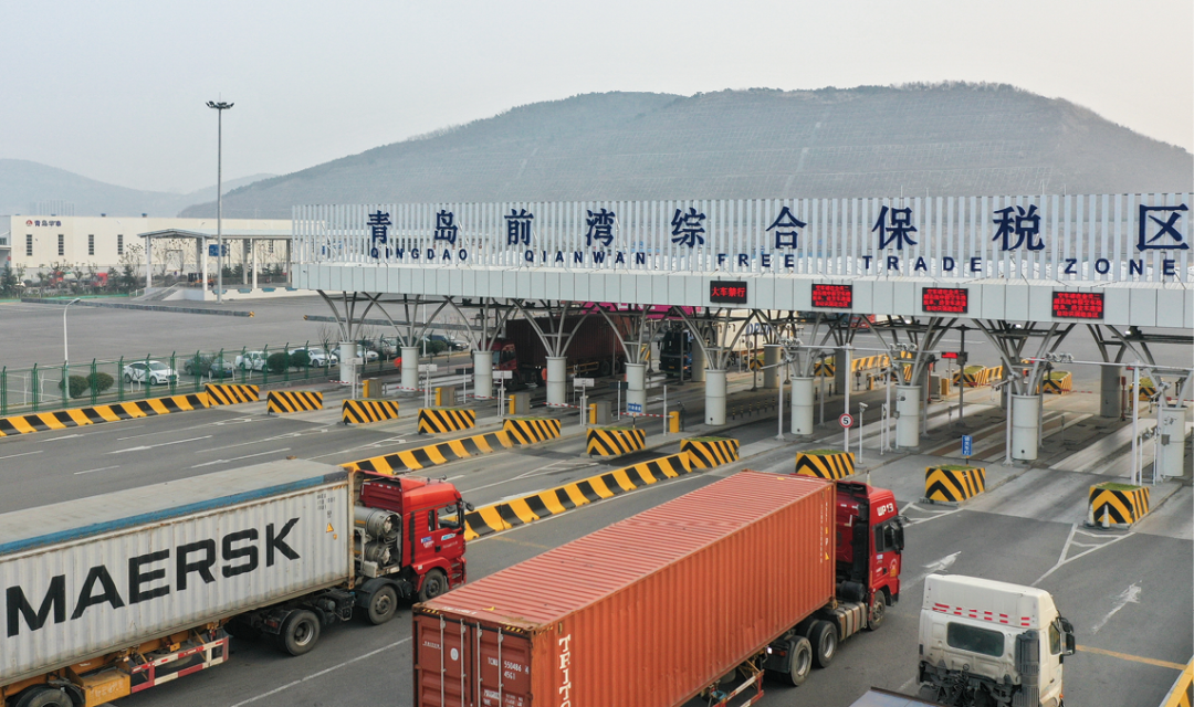 集装箱车辆进出青岛前湾综合保税区卡口。图 / 孙进涛