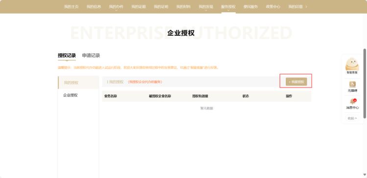 第一步:个人登录“一网通办”市民主页,选择政务服务—服务授权—企业授权,进入申请授权入口。